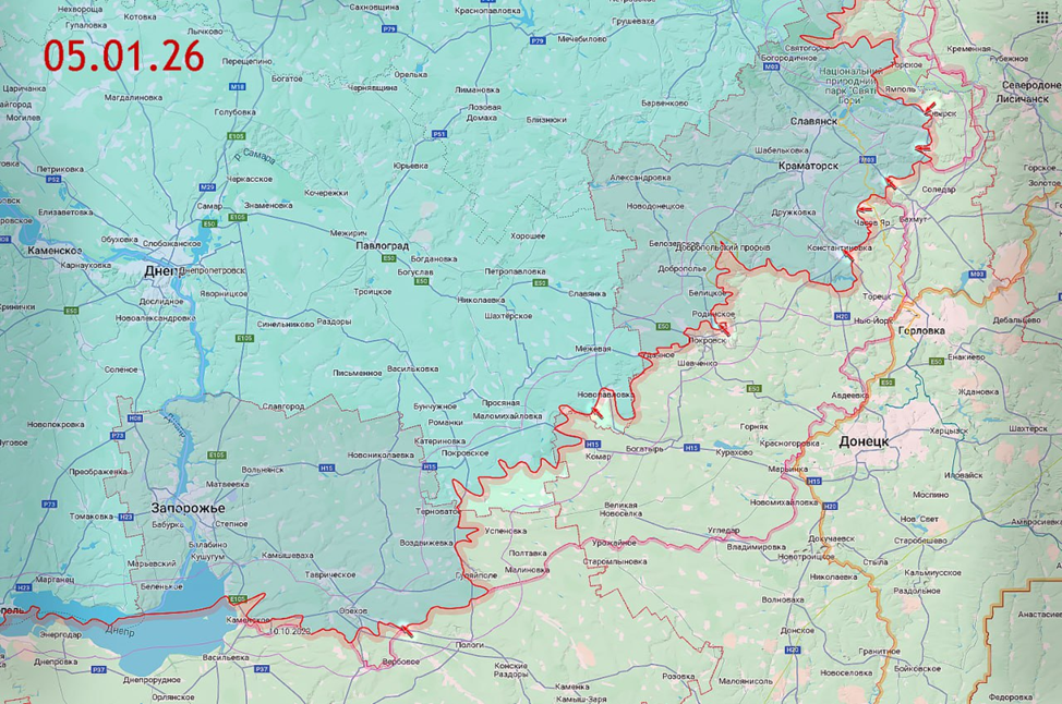 05.01.26 Сводка. Боевые действия с 01 по 04 января 2026 года. В Сумской зоне безопасности, Краснопольсий район, ведуться боевые действия в окрестностях Грабовского. На Северском направлении ВС РФ продвинулись в западном направлении вдоль трассы на Закотное и вышли на новые позиции по рубежу Пазено - Резниковка. В районе Артёмовска ВС РФ продвинулись вдоль трассы Е-40 и установили флаги РФ в Майском. В Константиновке ВС РФ начали боевые действия в районе складов железнодорожной станции. Уточнена зона контроля ВС РФ в Димитрове. В Днепропетровской области ВС РФ форсировали реку Солёная около Филии и продвинулись на западном берегу. Активизированы штурмовые действия ВС РФ на южных подступах к Белогорью в районе переправы через реку Конка. Карта https://goo.gl/maps/4eum5C9giNDebgXf7