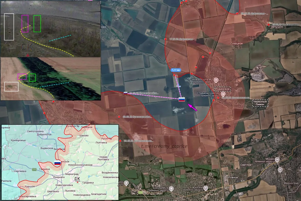 07.04.26 Красноармейск - Родинское Позиционные боевые действия в районе Красноармейска. ВС РФ увеличивают зону контроля к западу от Родинского на 1,5 км и занимают новую позицию. Передовая позиция ВС РФ обстреляна дроном ВСУ.