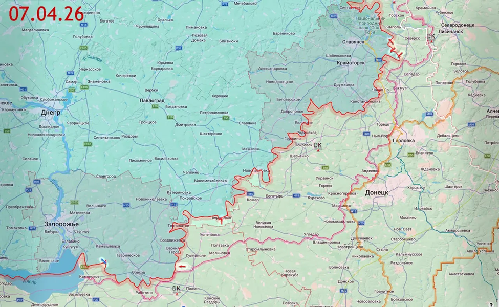 07.04.26 Сводка. Боевые действия с 03 по 06 апреля 2026 года. В районе Северска ВС РФ продолжили атакующие действия около Кривой Луки, а также зачистили опорный пункт севернее Никифоровки. В Днепропетровской зоне безопасности ВС РФ вернули под свой контроль ряд утраченных позиций в Берёзовом. Около Гуляйполя ВС РФ вышли на новые позиции севернее Мирного и увеличили контролируемую зону по рубежу Мирное - Комсомольское. Восточнее Степногорска ВСУ восстановили позиции в центральной части Новояковлевки. Карта https://goo.gl/maps/4eum5C9giNDebgXf7