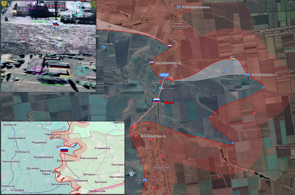 07.02.26 Гуляйполе – Доброполье. Активные боевые действия в районе Гуляйполя. Атака ВС РФ мотострелковым подразделением в направлении Доброполья. Штурмовая группа легких мотострелков под огнём противника достигает жилой застройки. Высадка десанта. Обстрел новых позиций ВС РФ. Увеличение зоны контроля ВС РФ 1,5 км по фронту вдоль русла реки Гайчур.