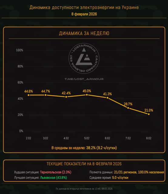 Инфографика доступности электроэнергии на территории Украины по областям на 8 февраля 2026. Среднее время доступности электроэнергии за сутки - 5 часов (21%) - самый низкий показатель с начала 2026 года! https://t.me/lost_armour/8086