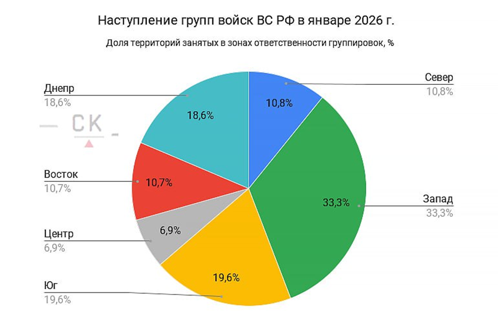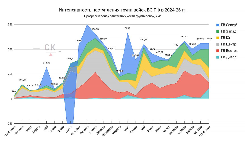 08.02.26 Группировки войск ВС РФ. Интенсивность наступления ВС РФ в зонах ответственности групп войск в 2024-26 годах. Представлены графики процентного соотношения вклада каждой группировки в общее продвижение за время наступления 2024-26 гг. и за январь 2026 г. * Данные по группе войск “Север” даны с учётом боевых действий в Курской области. Карта www.creamy-caprice.net https://t.me/creamy_caprice/11228