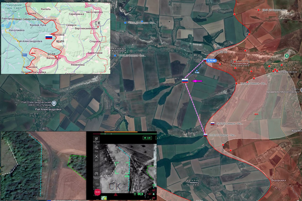 07.03.26 Северск - Резниковка Позиционные боевые действия в районе Северска. ВС РФ увеличили зону контроля около Резниковки и заняли новые позиции на 1,5 км южнее населённого пункта. Передовая позиция попала под огонь ВСУ.