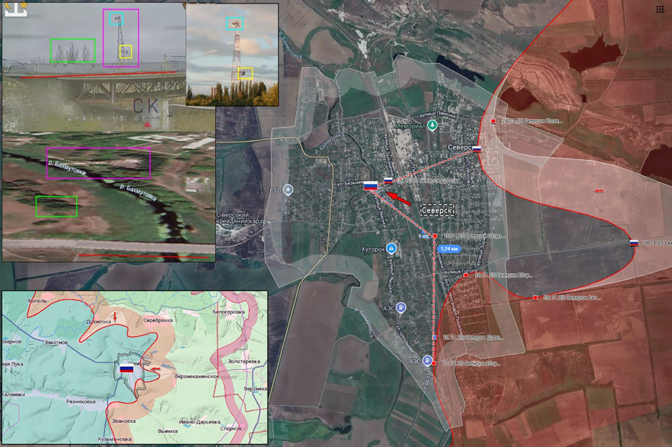 08.12.25 Северск Штурм Северска. Штурмовики ВС РФ форсируют речку Бахмутовка около автомобильного моста в центре Северска под огнём противника. Увеличение зоны контроля ВС РФ более 1 км и выход передовых подразделений в западную часть города.