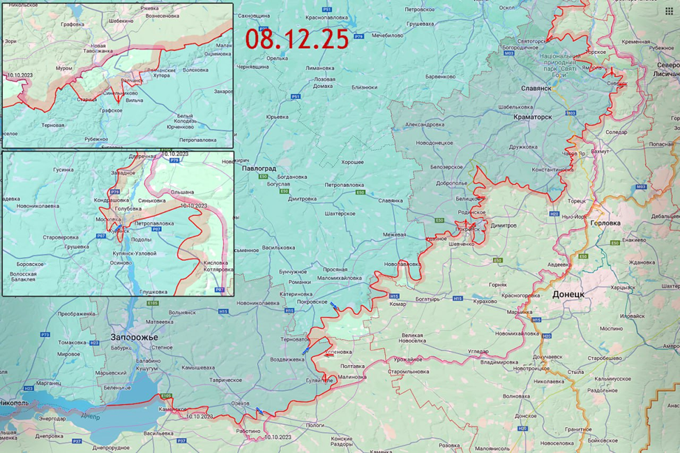 08.12.25 Сводка. Боевые действия с 04 по 07 декабря 2025 года. В Харьковской области ВС РФ продолжили атаковать в окрестностях Волчанска и заняли новые позиции в центральной части Лимана. В Купянске ВСУ предприняли попытку контратаки подразделением в составе иностранных военнослужащих атаковать позиции ВС РФ около железнодорожной станции. На Краснолиманском направлении ВС РФ увеличили зону контроля на северном охвате города и начали боевые действия на окраинах Яровой. Около Северска ВС РФ продвинулись вдоль железной дороги по направлению к городу. В самом Северске штурмовики ВС РФ зашли в квартал с многоэтажными домами и ведут боевые действия за удержание позиций. В районе Красноармейска ВС РФ заняли ряд новых позиций в горловине мешка севернее города и в жилой застройке в Ровном. В Днепропетровской зоне безопасности ВС РФ продолжают расширять контроль жилой застройки в Ивановке. В Тихом ВСУ провели контратаку и подняли флаги Украины в разных частях населенного пункта. Около Гуляйполя ВС РФ продвинулись в направлении Варваровки от Равнополья и приступили к штурму позиций ВСУ в Гуляйполе, зайдя на северные и восточные окраины города. В Доброполье ВСУ вернули часть позиций в населённом пункте под свой контроль. На Ореховском направлении ВСУ заняли новые позиции в центральной части Малой Токмачки.