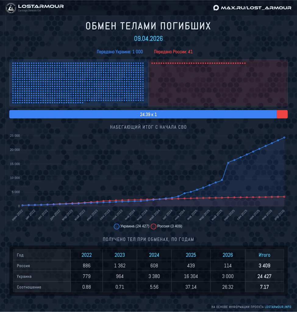 Сегодня произошел очередной ежемесячный обмен тел погибших военных. Украине было передано 1000 тел, России вернули 41. За всё время обменов суммарно было передано Украине 24427 тел, а России - 3409 Соотношение количества переданных тел по всем обменам составляет 7,17 к 1, а с начала 2026 года - 26,32 к 1 Сводка по обмену телами погибших между Россией и Украиной за 09.04.2026: https://lostarmour.info/be/2026-04-09