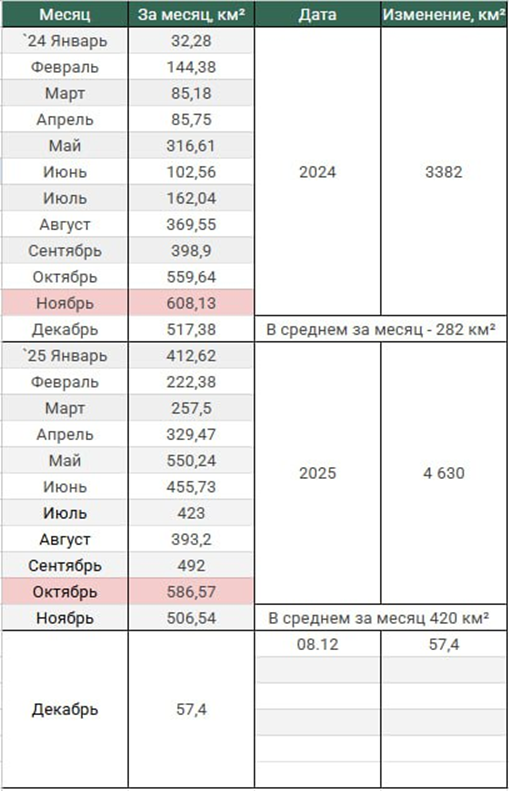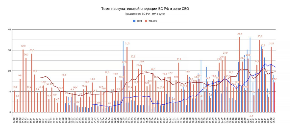 08.12.25 Темп наступления Среднесуточное продвижение ВС РФ в зоне проведения СВО. Обновление по данным c 04 по 07 декабря 2025. Темп продвижения +14,4 км² в сутки за период, общее продвижение 57.4 км².