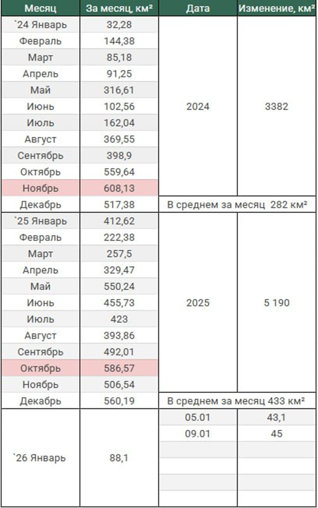 09.01.26 Темп наступления. Среднесуточное продвижение ВС РФ в зоне проведения СВО. Обновление по данным c 05 по 08 января 2026. Темп продвижения +11,3 км² в сутки за период, общее продвижение 45,0 км².