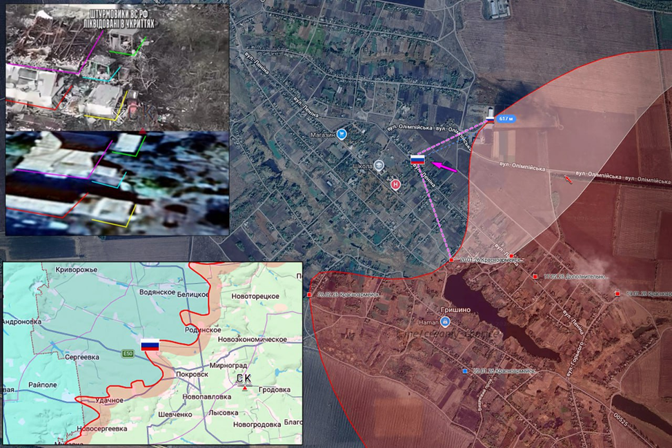 10.03.26 Красноармейск – Гришино. Позиционные боевые действия в районе Красноармейска. Передовая позиция ВС РФ в жилой застройке Гришино подверглась обстрелу ВСУ. ВС РФ продвинулись на 600 метров к центру посёлка и заняли новые позиции.