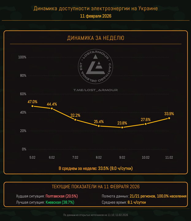 Инфографика доступности электроэнергии на территории Украины по областям на 11 февраля 2026. Среднее время доступности электроэнергии за сутки - 8,1 часов (33,9%) https://t.me/lost_armour/8138