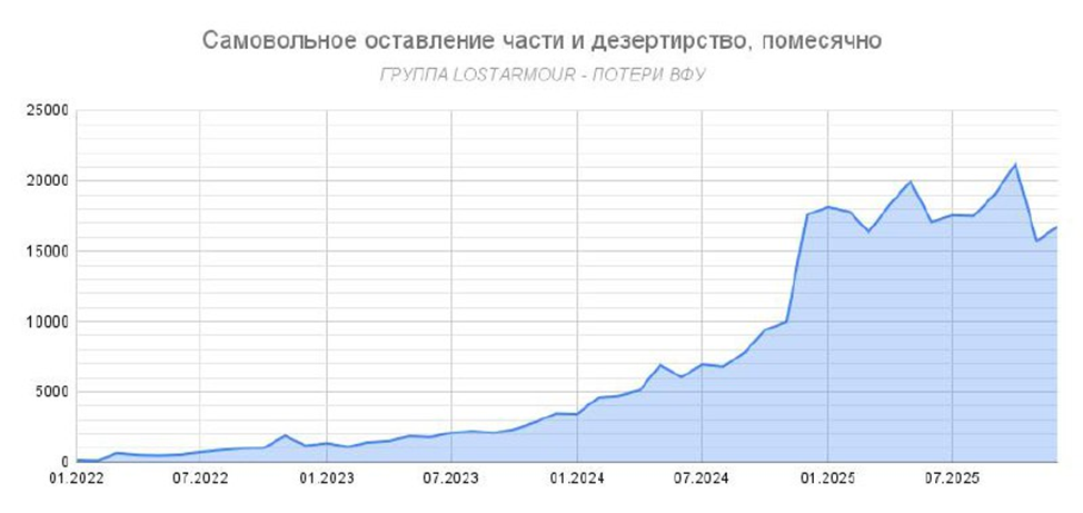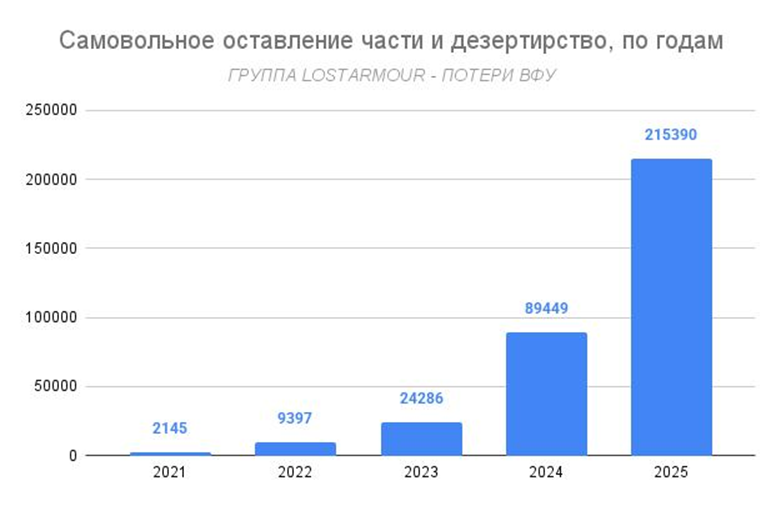 Украинская прокуратура подвела невеселые итоги 2025 года по бегству людей из армии. Всего за год суммарно сбежало более 215 тысяч человек, что в среднем составляет почти 18 тысяч в месяц. Этот процесс украинские власти пытались остановить как пряником (несколько амнистий для дезертиров и самовольщиков), так и кнутом (отправка пойманных в штурмовые подразделения). Результат на лицо - поток не уменьшается.