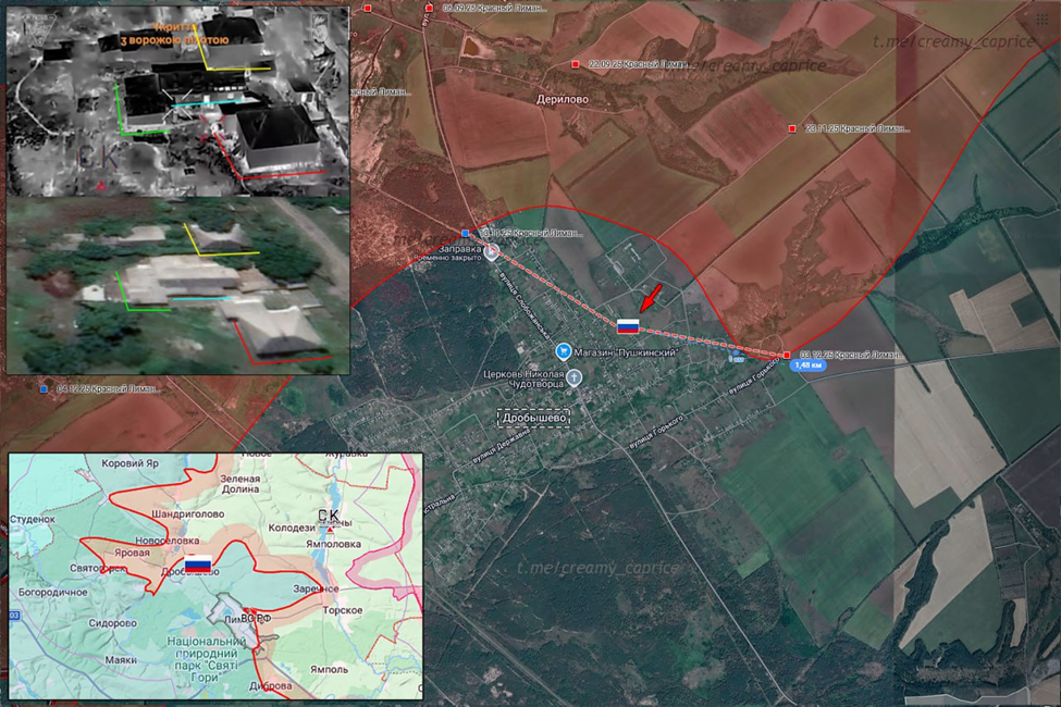 12.02.26 Красный Лиман - Дробышево Позиционные боевые действия в районе Красного Лимана. Передовая позиция ВС РФ в жилой застройке Дробышево обстреляна ВСУ. ВС РФ продвинулись на 1,5 км и заняли новые позиции в восточной части посёлка.