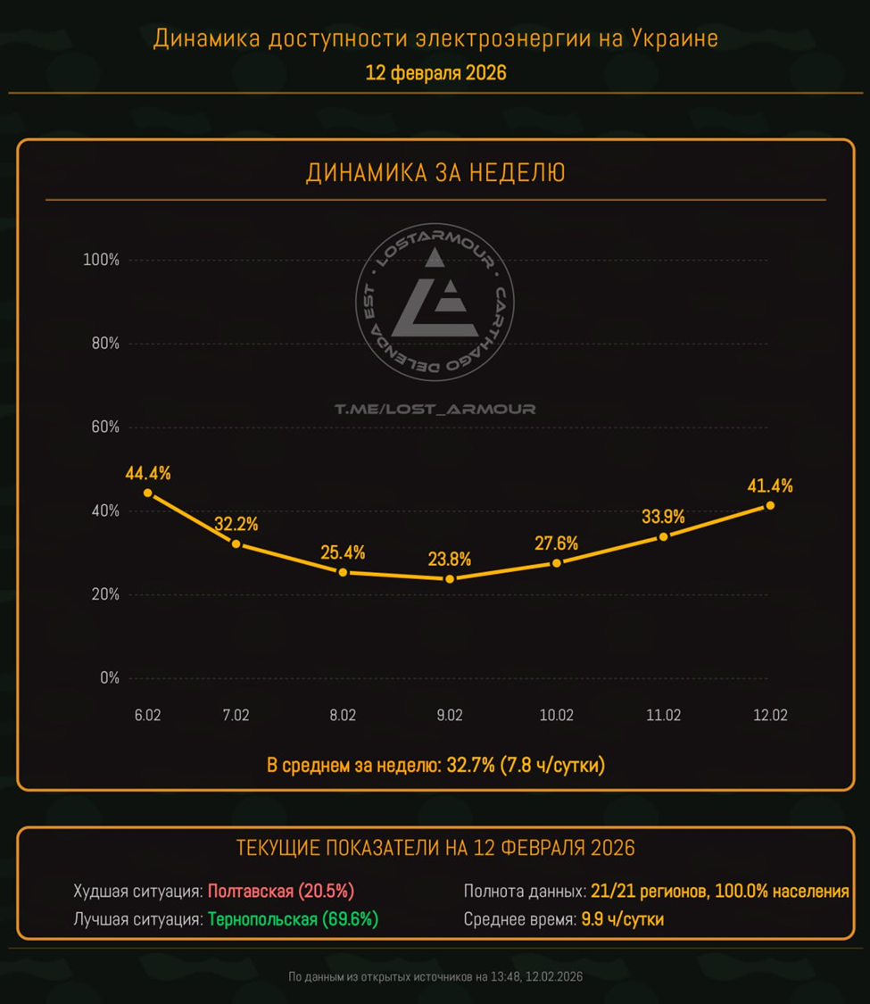 Инфографика доступности электроэнергии на территории Украины по областям на 12 февраля 2026. Среднее время доступности электроэнергии за сутки - 9,9 часов (41,4%)! https://t.me/lost_armour/8154
