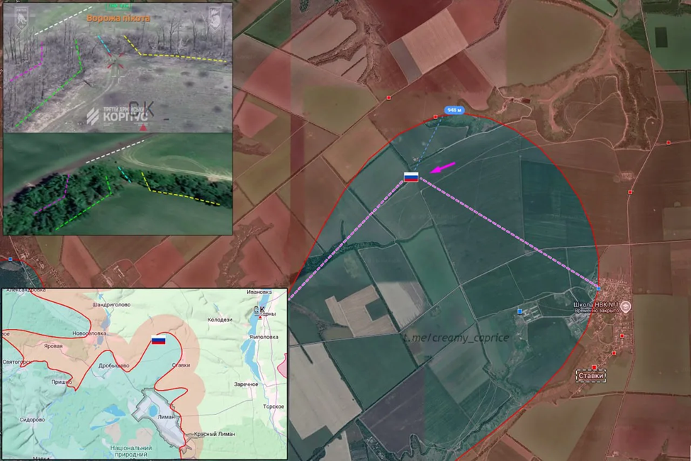 13.04.26 Красный Лиман - Ставки Активные боевые действия в районе Красного Лимана. ВС РФ расширяют зону контроля около ставков и занимают новую позицию. Обстрел со стороны ВСУ. ВС РФ продвинулись до 1 км и заняли новые позиции севернее населённого пункта.