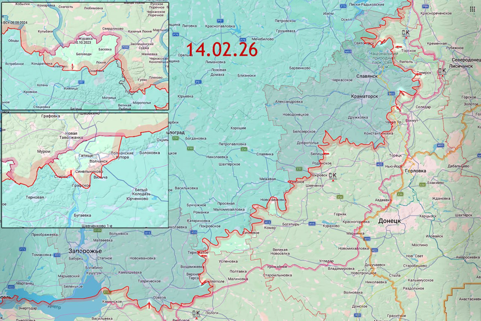 14.02.26 Сводка. Боевые действия с 10 по 13 февраля 2026 года. В Сумской зоне безопасности ВС РФ проводили атакующие действия в направлении населённого пункта Корчаковка. В Харьковской зоне безопасности увеличена зона контроля ВС РФ в Бугроватке. На Краснолиманском направлении ВС РФ заняли новые позиции в жилой застройке Дробышево и по рубежу Красный Лиман - Ставки. В районе Северска ВС РФ продвинулись в Никифоровке и на рубеже Платоновка - Резниковка. Около Артёмовска под контроль ВС РФ перешла северная часть Орехово-Василевки. На Красногвардейском направлении ВС РФ продвигаются к Белицкому и занимают новые позиции вдоль железной дороги. В районе Гуляйполя ВСУ продолжает атаковать позиции ВС РФ нанося контратакующие удары в Косовцево и определяя границы зоны контроля ВС РФ. В Зализничном подняты флаги Российской Федерации. Карта https://goo.gl/maps/4eum5C9giNDebgXf7
