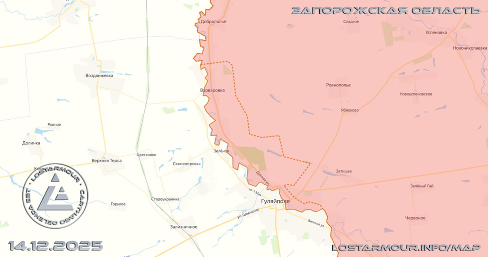 14.12.25 Гуляйполе - Варваровка Последствия боевых действий в районе Гуляйполя. Военнослужащие ВС РФ поднимают флаги Российской Федерации в Варваровке и фиксируют своё присутствие в южной части населённого пункта. Продвижение ВС РФ 3,5 км на северном охвате Гуляйполя, выход передовых подразделений на трассу к Покровскому. https://t.me/voin_dv/18039