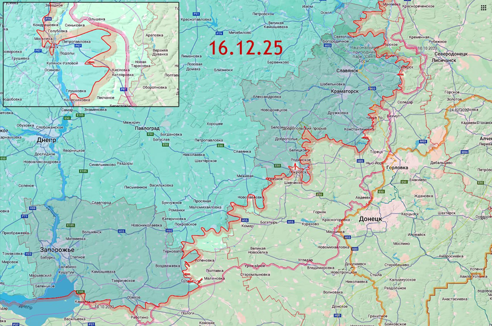 16.12.25 Сводка. Боевые действия с 12 по 16 декабря 2025 года. В северной части Купянска отмечаются рейды ВСУ в глубину оборонительных порядков ВС РФ. На левом берегу реки Оскол ВС РФ вышли на восточную окраину Куриловки. На Северском направлении ВС РФ заняли новые позиции в Кирово. Южнее Константиновки ВС РФ укрепили своё положение вдоль реки Кривой Торец около Иванополья. Севернее Красноармейка ВС РФ взяли под уверенный контроль комплекс сельскохозяйственных сооружений в горловине Красноармейского мешка. В районе Гуляйполя ВС РФ продвинулись к трассе на Покровское и подняли флаги в южной части Варваровки, проведен штурм позиций ВСУ к югу от Доброполья. В Гуляйполе штурмовые подразделения ВС РФ заняли новые позиции в восточной части города, продвинулись в жилой застройке южнее центра и ведут бои за северные окраины на левом берегу реки Гайчур.