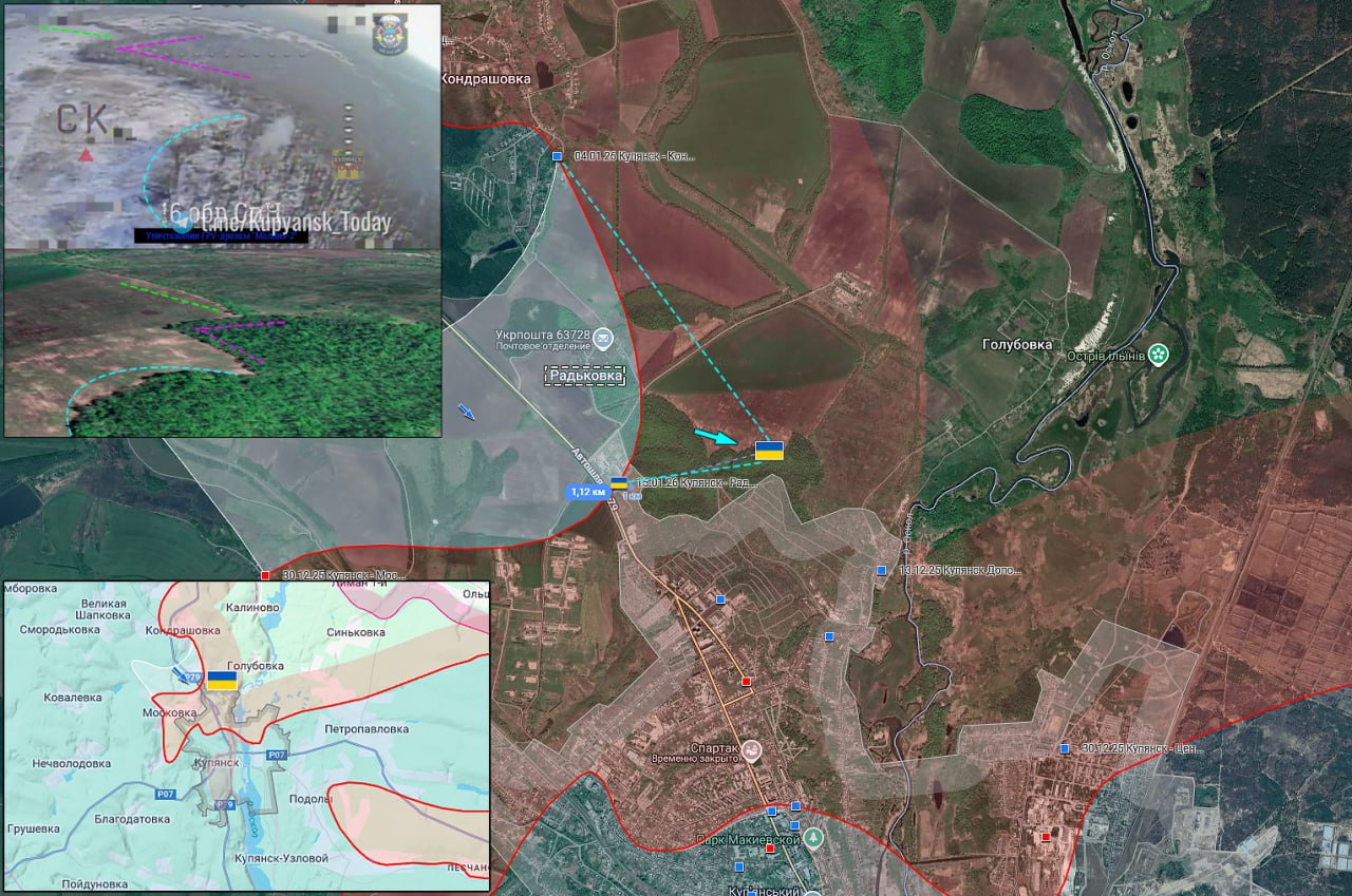 15.01.26 Купянск - Радьковка. Позиционные боевые действия в районе Купянска. ВСУ продвигаются в окрестностях Радьковки и занимают новые позиции на северных подступах к городу. Увеличение зоны контроля ВСУ 1 км. Обстрел позиции ВСУ со стороны ВС РФ.