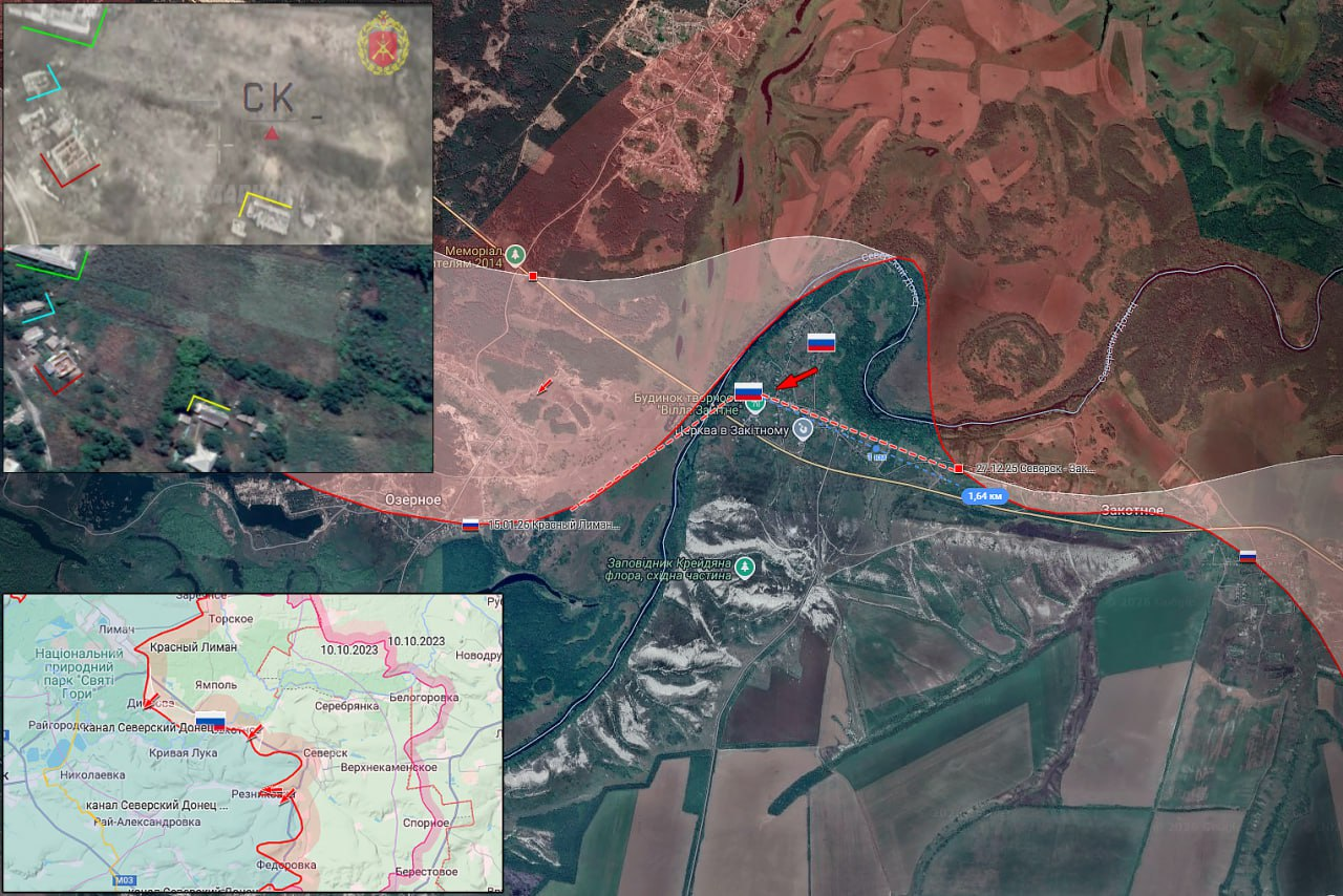 На Краснолиманском направлении штурмовые подразделения ВС РФ атаковали вдоль русла реки Северский Донец и вышли в ближайшие окрестности населённого пункта Пришиб, занят ряд новых позиций в Диброва и Озёрном.