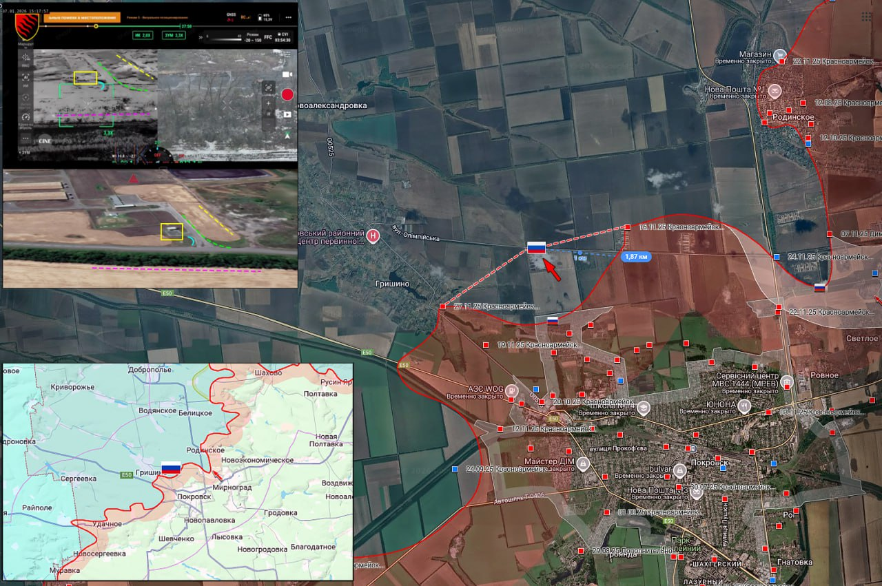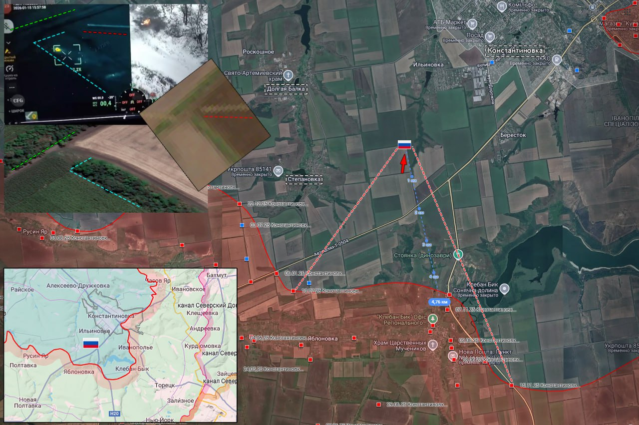 17.01.26 Константиновка - Ильиновка. Позиционные боевые действия в районе Горловки. Передовая позиция ВС РФ обстреляна дроном ВСУ. ВС РФ продвинулись до 5 км к Константиновке с южного направления и заняли новые позиции около Ильиновки.