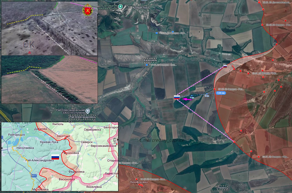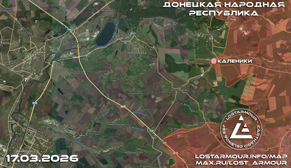 17.03.26 Северск - Каленики Активные боевые действия в районе Северска. Атака ВС РФ пехотным подразделением южнее населённого пункта Каленики. Штурмовая группа зачищает опорный пункт ВСУ. Продвижение ВС РФ на 2,5 км в направлении Рай-Александровки. https://t.me/OMSBr_123/1757