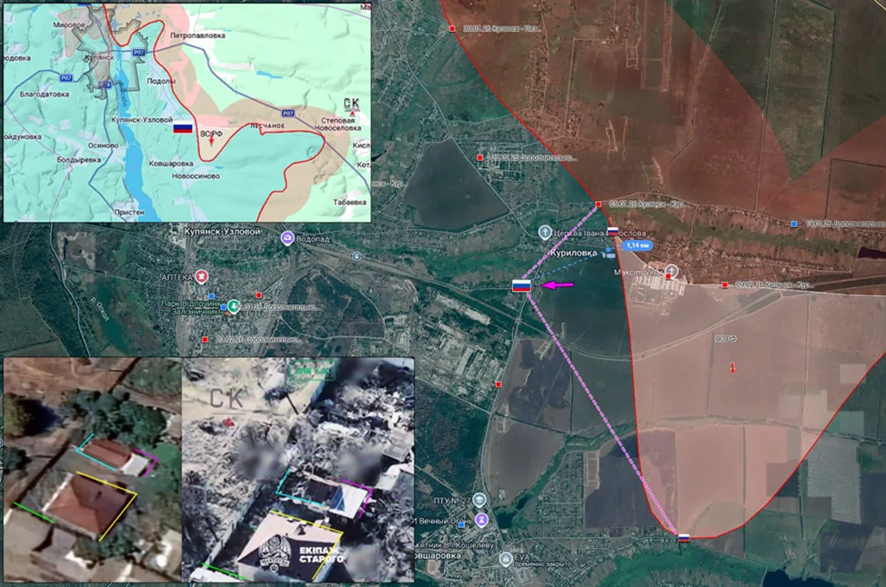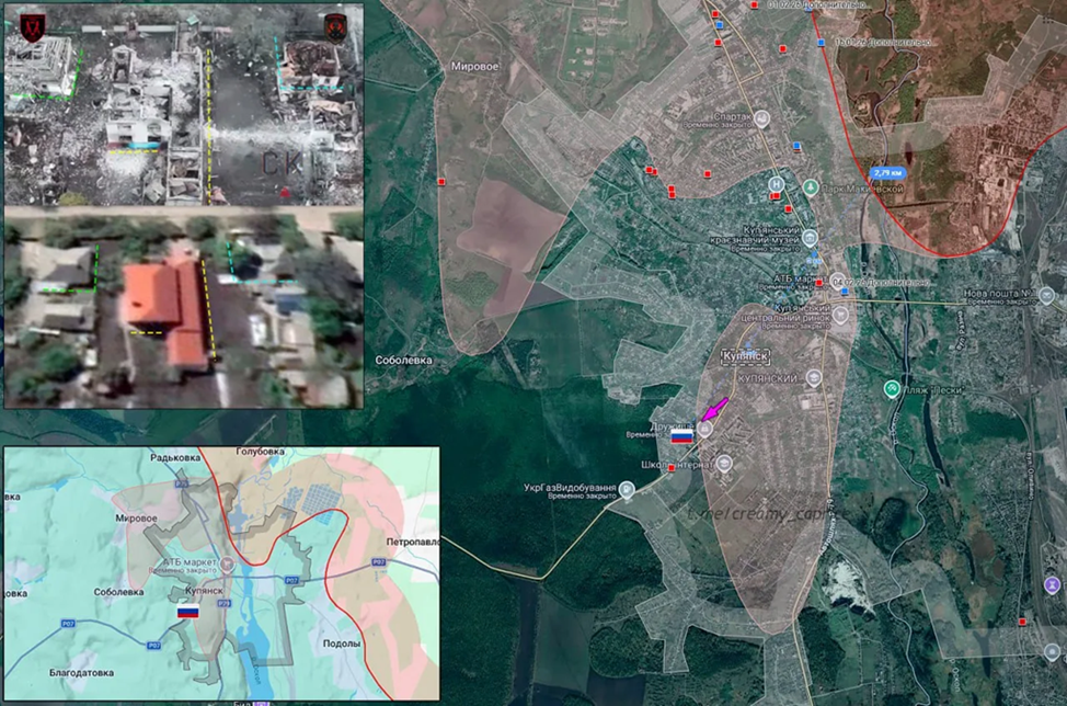 14.03.26 Купянск - Куриловка Активные боевые действия в районе Купянска. Атака ВС РФ пехотным подразделением. Штурмовая группа занимает новые позиции в жилой застройке Куриловки. Продвижение ВС РФ около 1 км, выход в центральную часть.
