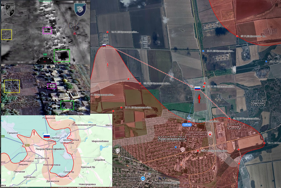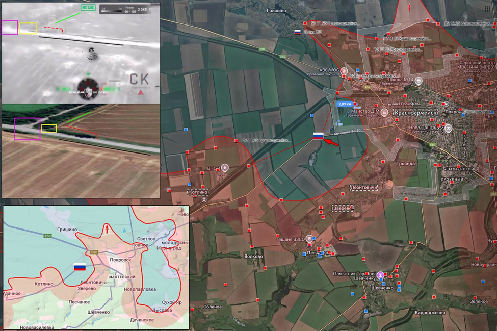 17.12.25 Красноармейск Позиционные боевые действия в районе Красноармейска. ВС РФ взяли под контроль западный выезд из города по трассе на Межевую, продвинувшись от окраин Красноармейска более 2 км. Военнослужащие ВС РФ попали под обстрел на рубеже Красноармейск - Котлино.