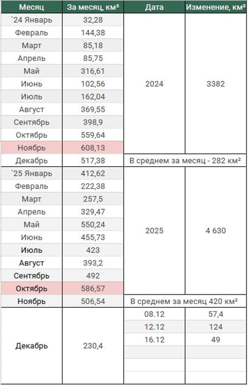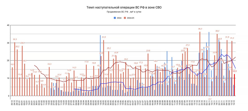 16.12.25 Темп наступления Среднесуточное продвижение ВС РФ в зоне проведения СВО. Обновление по данным c 12 по 15 декабря 2025. Темп продвижения +12.3 км² в сутки за период, общее продвижение 49.0 км².