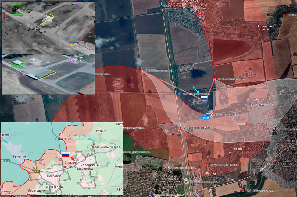 17.01.26 Красноармейск – Светлое. Активные боевые действия в районе Красноармейска. Атака ВСУ пехотным подразделением в направлении позиций ВС РФ около Светлого. Подрыв сельскохозяйственной постройки. ВС РФ усилили позиции контролирующие западный въезд в Димитров, продвинувшись более 500 метров.