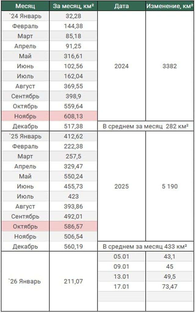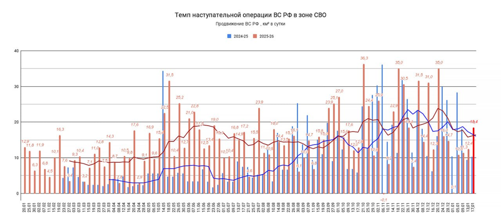 17.01.26 Темп наступления. Среднесуточное продвижение ВС РФ в зоне проведения СВО. Обновление по данным c 13 по 16 января 2026. Темп продвижения +18,4 км² в сутки за период, общее продвижение 73,4 км²