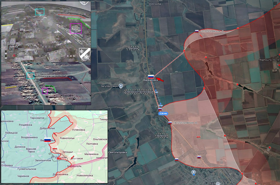 18.12.25 Гуляйполе - Варваровка Позиционные боевые действия в районе Гуляйполя. ВС РФ продвинулись в Варваровке к северу на 2.5 км и заняли новые позиции в центральной части населённого пункта. Передовая позиция ВС РФ в жилой застройке под огнём ВСУ.