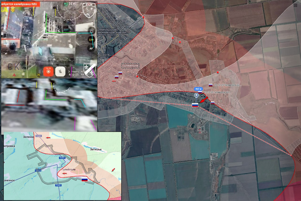 18.12.25 Гуляйполе Штурм Гуляйполя. ВС РФ увеличили зону контроля на левом берегу реки Гайчур продвинувшись в восточной части города до 500 метров. Передовая позиция ВС РФ в частном секторе подверглась обстрелу ВСУ.