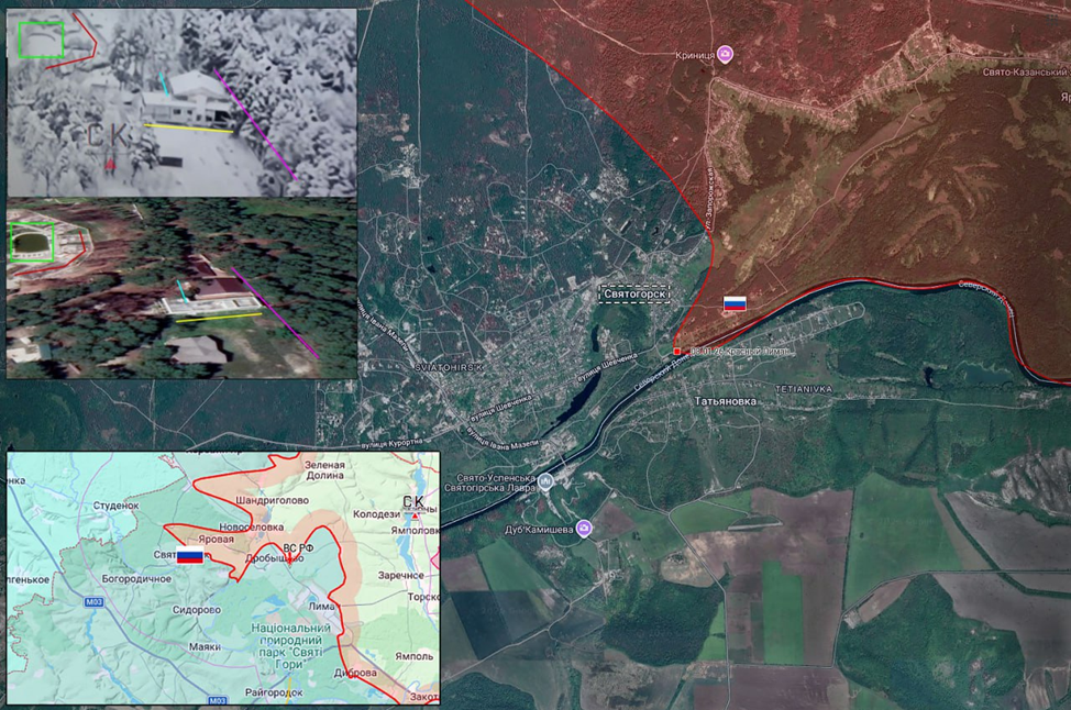 19.02.26 Красный Лиман - Святогорск. Последствия боевых действий в районе Красного Лимана. Военнослужащие ВС РФ установили флаг Российской Федерации на одном из зданий коттеджного городка в окрестностях Святогорска, подтверждая уверенный контроль ВС РФ восточных подступов к городу.