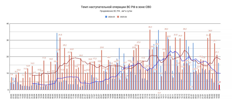 18.02.26 Темп наступления. Среднесуточное продвижение ВС РФ в зоне проведения СВО. Обновление по данным c 14 по 17 февраля 2026. Темп продвижения +3,0 км² в сутки за период, общее продвижение 11,9 км².