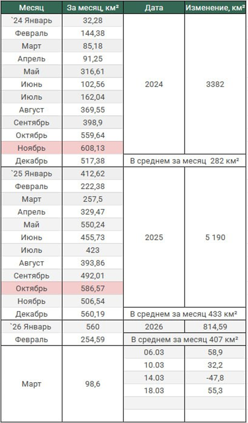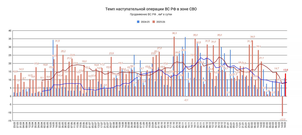 18.03.26 Темп наступления Среднесуточное продвижение ВС РФ в зоне проведения СВО. Обновление по данным c 14 по 17 марта 2026. Темп продвижения +13,8 км² в сутки за период, общее продвижение +55,3 км².