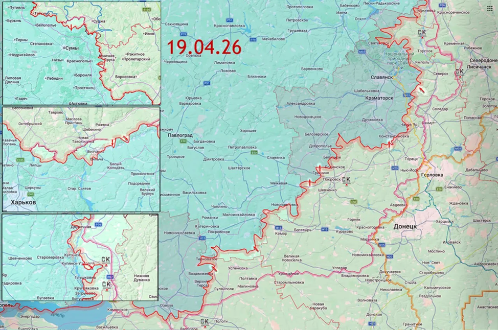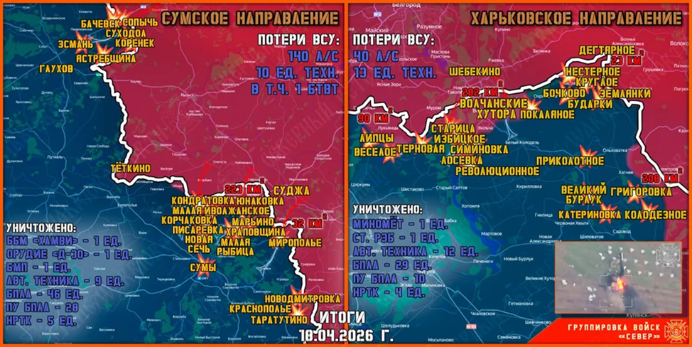 19.04.26 Сводка. Боевые действия с 15 по 18 апреля 2026 года. В Сумской зоне безопасности ВС РФ увеличили зону контроля заняв новые позиции в населённом пункте Таратутино и в направлении Корчаковки. В Харьковской зоне безопасности ВС РФ завязали боевые в жилой застройке Зыбино и Охримовки. На Купянском направлении ВС РФ занят опорный пункт южнее Песчаного и по архивному видео установлена зона контроля в Куриловке. В районе Северска ВС РФ зачистили позицию ВСУ на рубеже Каленики - Липовка. Около Константиновки ВС РФ заняли новые позиции в южной части населённого пункта Ильиновка. На Красноармейском направлении ВС РФ ведут боевые действия на подступах к Новоалександровке, а также на терриконе шахты “Красноармейская - Западная №1”. В Днепропетровской зоне безопасности под контроля ВС РФ перешла северная часть Терновго. В районе Гуляйполя имеется продвижение ВС РФ в жилой застройке Доброполья. Карта https://goo.gl/maps/4eum5C9giNDebgXf7