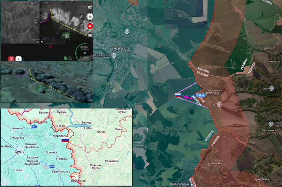 19.04.26 Сумы - Мирополье Позиционные боевые действия в Сумской зоне безопасности. ВС РФ продвинулись на 1 км от демаркационной линии к Мирополью с восточного направления. Передовая позиция ВС РФ под огнём ВСУ.