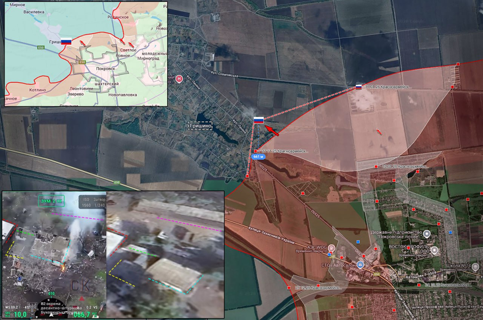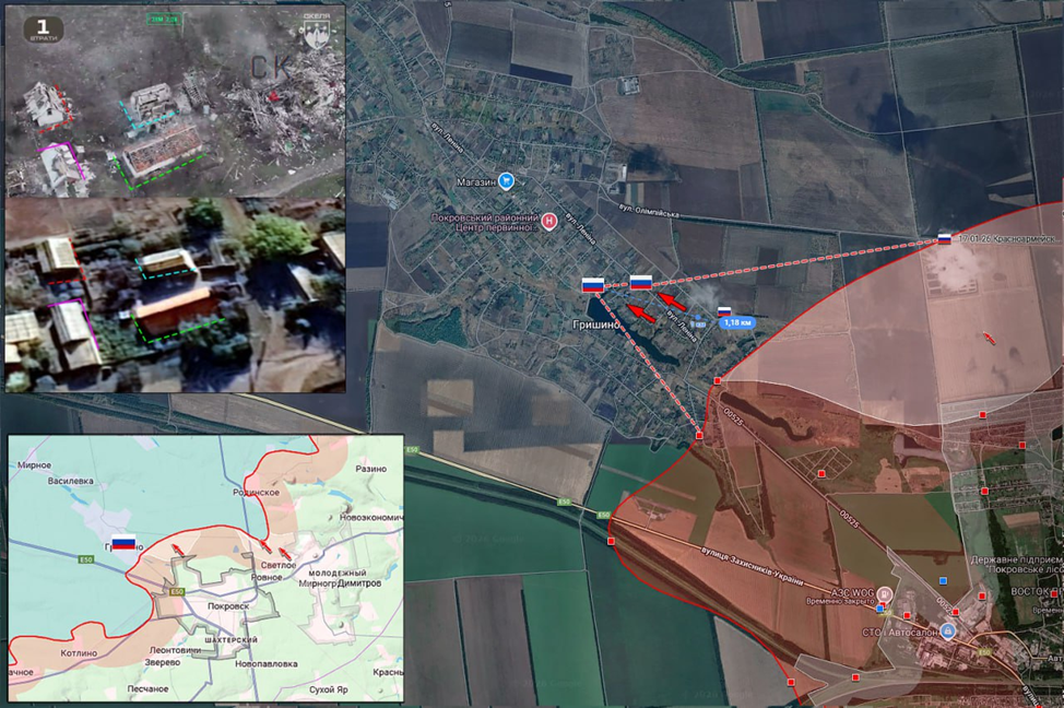 19.01.26 Красноармейск – Гришино. Позиционные боевые действия в районе Красноармейска. Передовая позиция ВС РФ в жилой застройке Гришино обстреляна FPV-дроном ВСУ. ВС РФ увеличили зону контроля в посёлке, продвинувшись в восточной части более 600 метров.