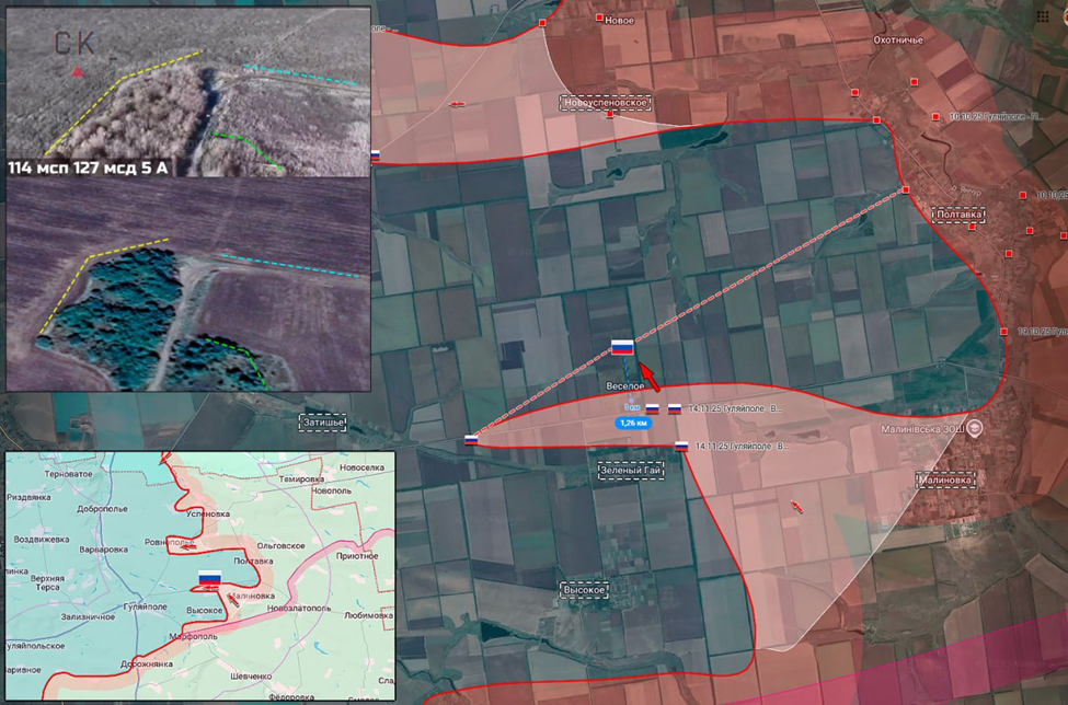 20.11.25 Гуляйполе - Весёлое Последствия боевых действий в районе Гуляйполя. ВС РФ продвинулись в населённом пункте Весёлое около 1 км и достигли северной окраины. Развёрнуты флаги Российской Федерации. Весёлое под уверенным контролем сил РФ. https://t.me/voin_dv/17752