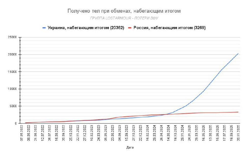 Россия в ходе СВО передала Украине свыше 20 000 тел военнослужащих ВСУ, из них свыше 15 000 - в 2025 году! На связи группа по подсчету потерь ВФУ. Сегодня произошел уже традиционный обмен тел погибших военных. Украине снова было передано 1000 тел, России вернули 30. Всего за 2025 год передано 15 301 тело, а за всё время как минимум 20