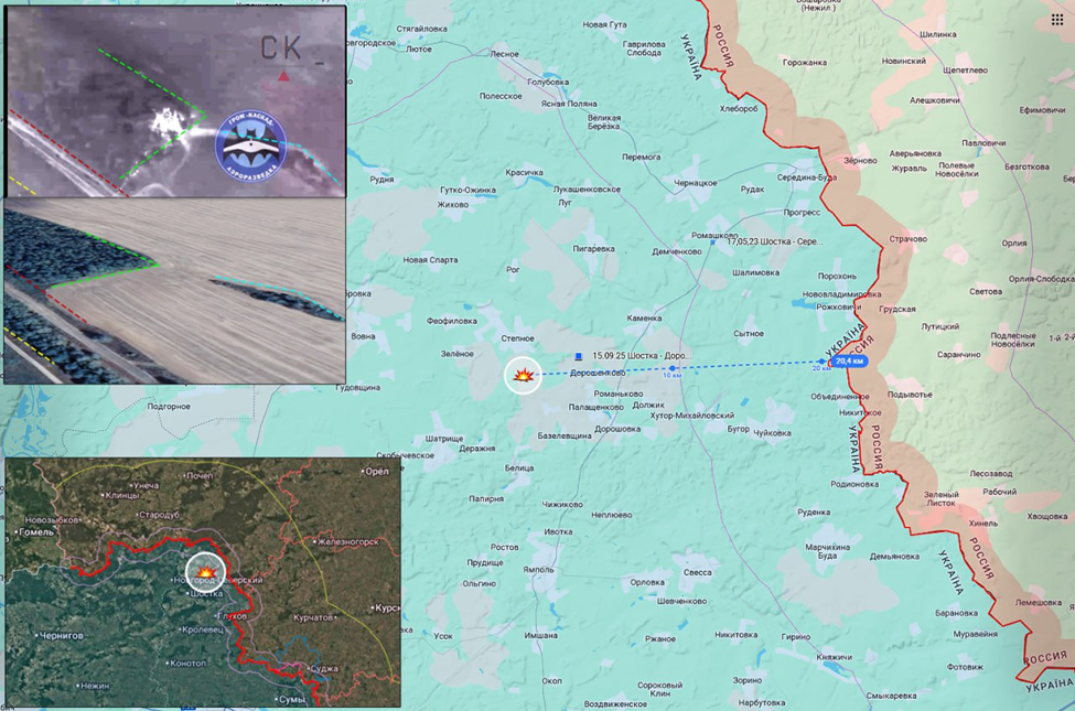 20.01.26 Шостка - Степное Боевые действия в глубине обороны ВСУ. Обстрел барражирующими боеприпасами ВС РФ позиции военной техники ВСУ в Сумской области около Степного. Заявлено как комплекс радиоэлектронной разведки. Удаление от демаркационной линии более 20 км. https://t.me/brigadagromkaskad/43