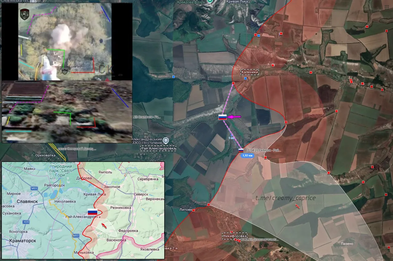 21.04.26 Северск - Рай-Александровка Позиционные боевые действия в районе Северска. Передовая позиция ВС РФ в жилой застройке Рай-Александровки обстреляна с дрона ВСУ. ВС РФ продвинулись около 2 км и заняли новые позиции на восточной окраине населённого пункта.