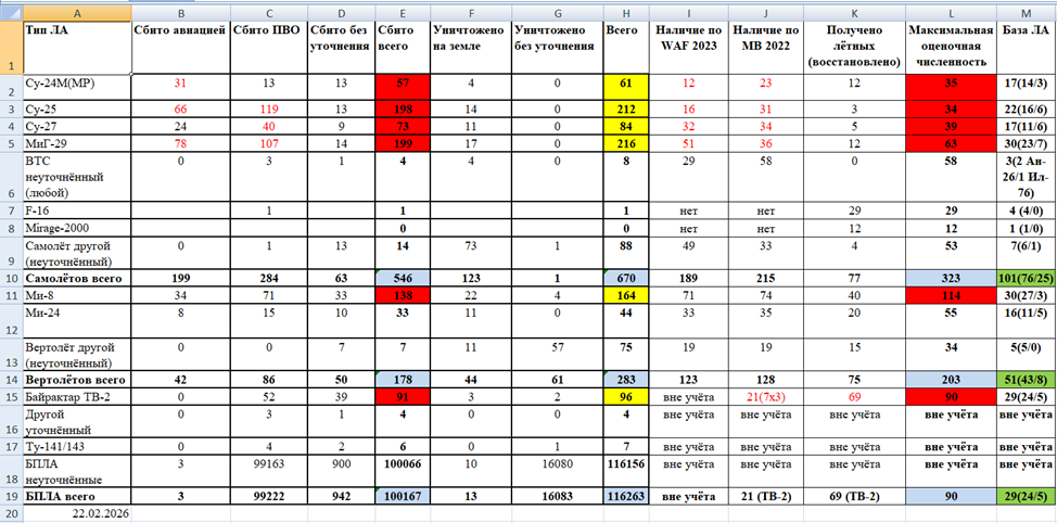 Данные по потерям ВВС ВСУ, еженедельное обновление: