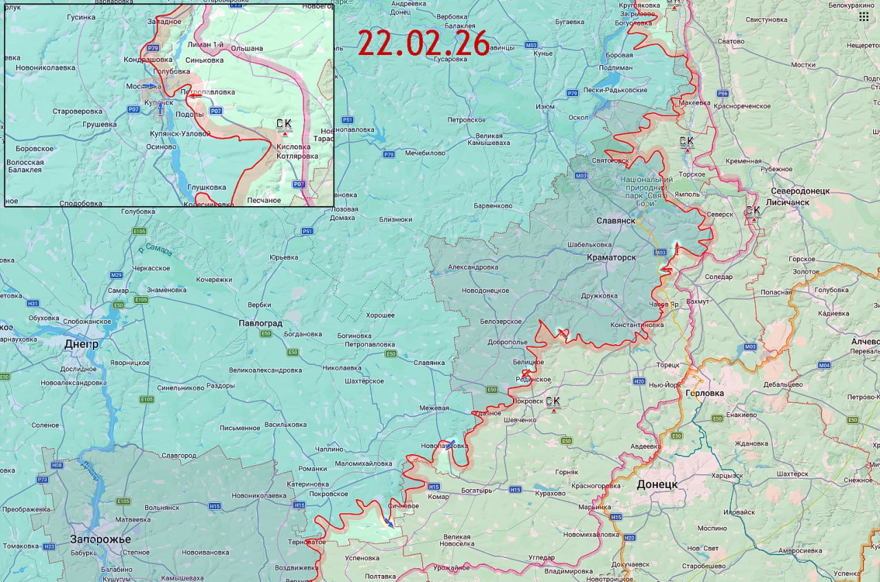 22.02.26 Сводка. Боевые действия с 18 по 21 февраля 2026 года. В районе Купянска ВС РФ продвинулись в Куриловке и заняли новые позиции в южной части населённого пункта. Около Северска ВС РФ продолжают вести наступательные боевые действия в центре Никифоровки. На Артёмовском направлении ВС РФ подняли боевое знамя на западе Миньковки. На Добропольском выступе ВС РФ атакуют в западной части Торецкого и занимают новые позиции около шахты “Запорожская” севернее Красноармейска. В Днепропетровской зоне безопасности ВСУ вернули часть утраченных позиций в Новопавловке и вышли в жилую застройку Новопетровского. Карта https://goo.gl/maps/4eum5C9giNDebgXf7