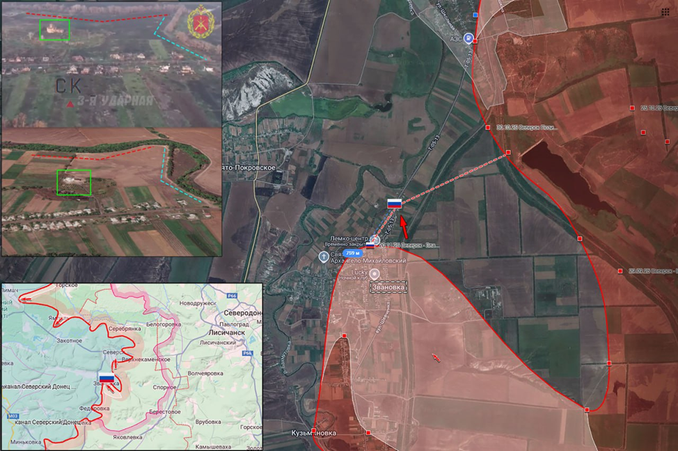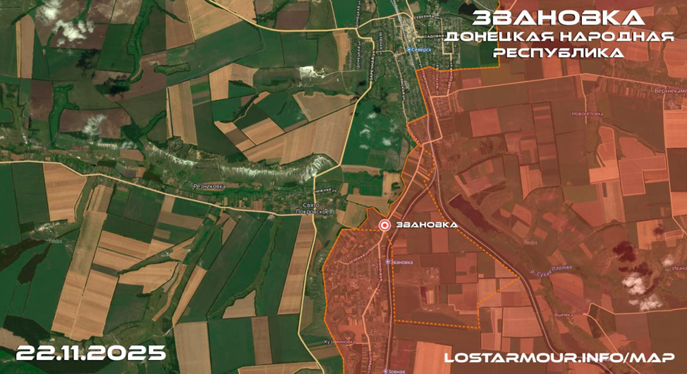 22.11.25 Северск – Звановка. Последствия боевых действий в районе Северска. В результате боевых действий в населённом пункте Звановка штурмовые подразделения ВС РФ продвинулись более 700 метров, заняли новые позиции в жилой застройке и подняли флаг Российской Федерации в северной части посёлка.