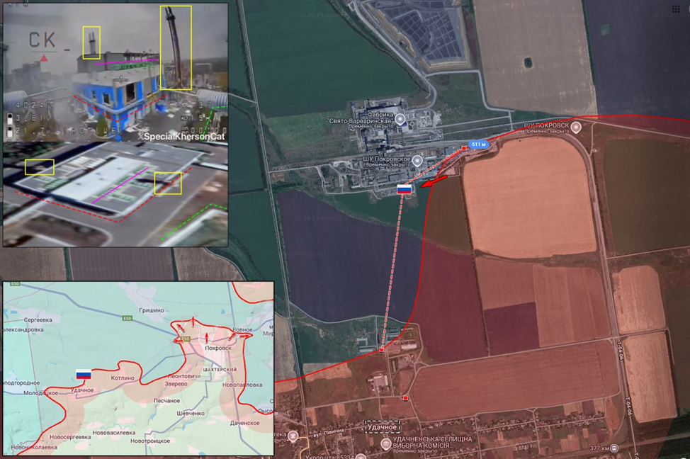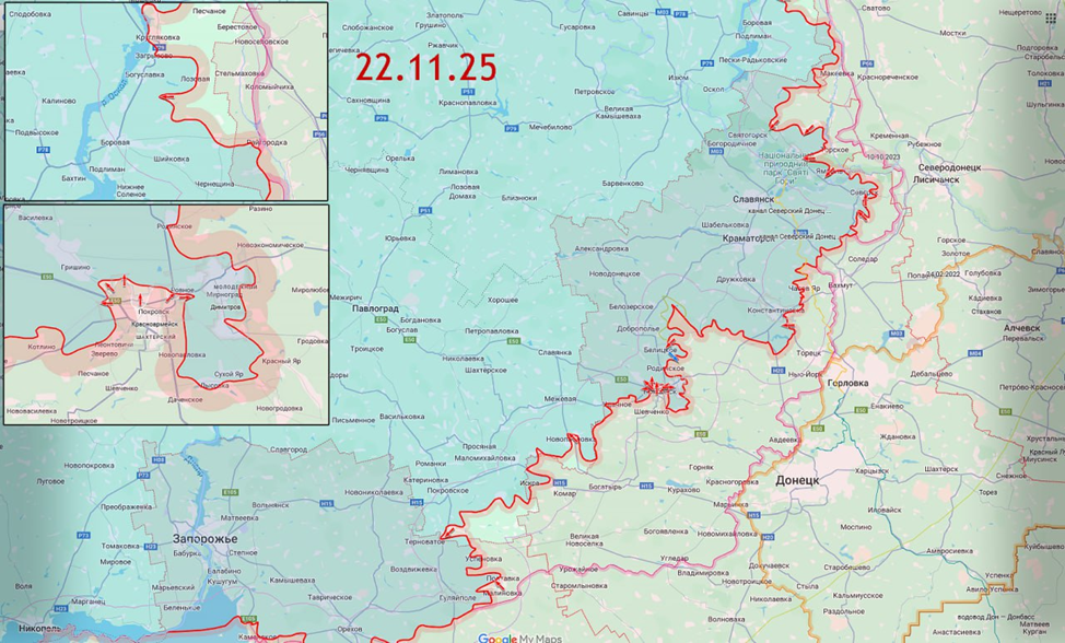22.11.25 Красноармейск – Удачное. Позиционные боевые действия в районе Красноармейска. ВС РФ удалось продвинуться на территории шахты "Красноармейская- Западная №1" и занять новые позиции в производственных помещениях. Передовые позиции под ударом ВСУ.