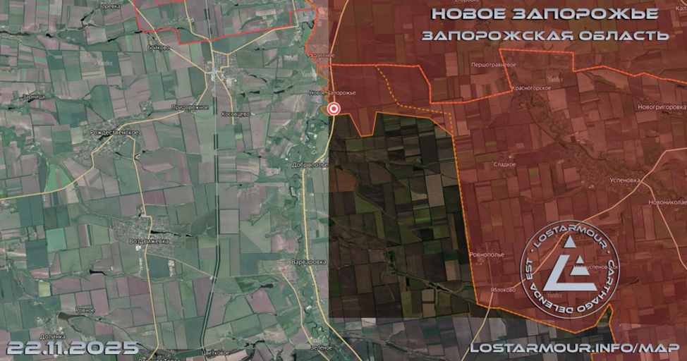 22.11.25 Сводка. Боевые действия с 18 по 21 ноября 2025 года. В районе Боровой ВС РФ заняли крупный опорный пункт севернее Боровской Андреевки. На Краснолиманском направлении подняты флаги РФ в населенных пунктах Новосёловка, Ставки и Ямполь. Начались боевые действия за позиции в районе Коммунальный города Красный Лиман. На Северском направлении штурмовые подразделения приступили к штурму города зайдя городскую застройку. На южном фланге заняты новые позиции в Звановке. Около Константиновки под контроль ВС РФ перешло Иванополье. На северном фланге Красноармейска расширена зона контроля ВС РФ в Дорожном. В Красноармейске ВС РФ заняли ряд новых позиций в районах Динасовый Посёлок, Посёлок Щербакова, увеличены зоны контроля вдоль восточной, северной и западной окраин. Ведуться бои с продвижением штурмовых отрядов ВС РФ в направлении Гришино. Днепропетровская зона безопасности, район Межевой - продвижение ВС РФ в Новопавловке к западной части посёлка. Район Покровского: подняты флаги ВС РФ в северной части Радостного.