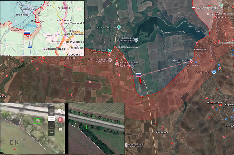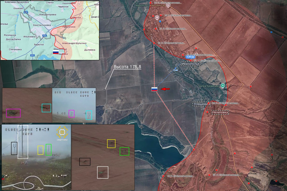 21.12.25 Константиновка - Плещеевка Активные боевые действия в районе Горловки. Атака ВС РФ мотострелковым подразделением на запад от Плещеевки в направлении высоты 178,8. Штурмовая группа из лёгких мотострелков попала под обстрел ВСУ. ВС РФ увеличивают хону контроля на южном охвате Константиновки до 1,5 км.