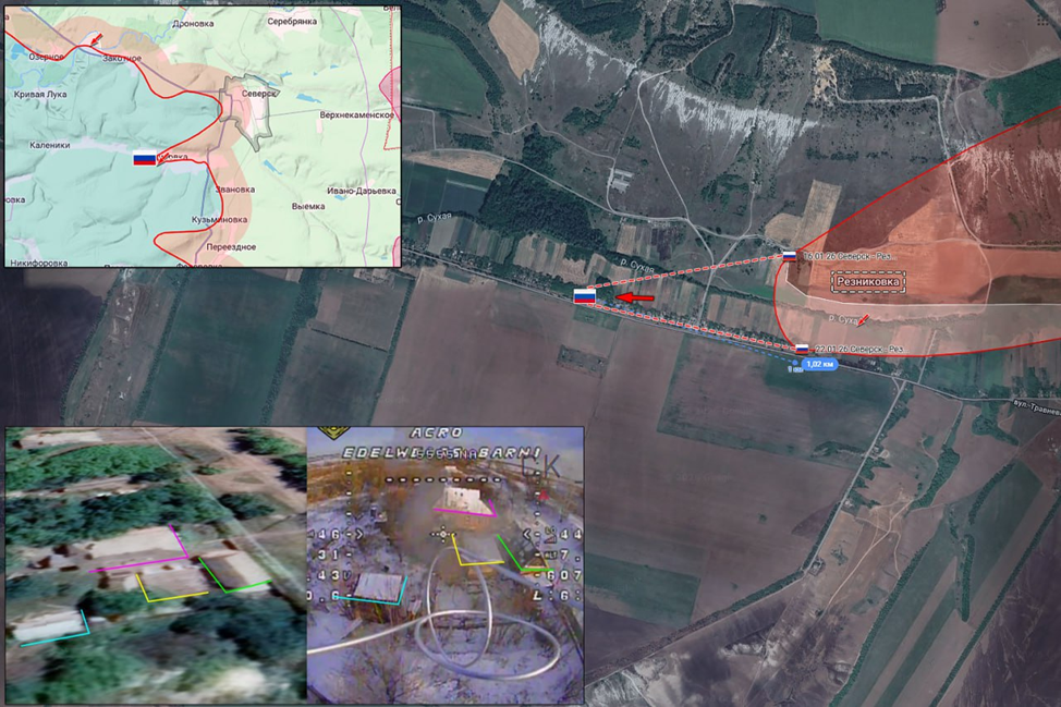 23.01.26 Северск – Резниковка. Позиционные боевые действия в районе Северска. Штурмовики ВС РФ продвинулись вдоль русла реки Сухая в Резниковке на 1 км и заняли новые позиции в жилой застройке. Передовая позиция ВС РФ попала под огонь FPV-дрона ВСУ.