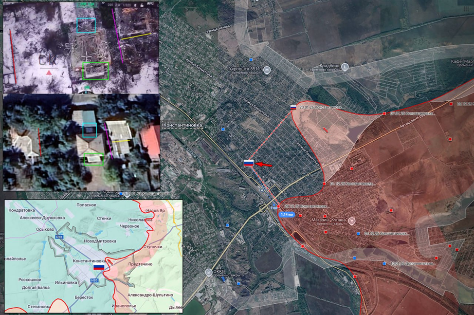 23.01.26 Константиновка - Железнодорожный вокзал. Штурм Константиновки. Передовая позиция ВС РФ в частном секторе города обстреляна дроном ВСУ. ВС РФ смогли продвинуться в жилой застройке района Железнодорожный вокзал, увеличить зону контроля на 1 км и занять новые позиции.
